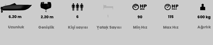 Siz de Safter 620 Dancer modelimizi seçin arkanıza bakmayın. Safter 620 Dancer fiber tekne modelimizle denizde hız ve konforun tadını çıkarın. 620 Dancer polyester tekne modelimiz 620 cm uzunluğa, 220 cm genişliğe, 40 cm drafta ve 600 kg boş ağırlığa sahiptir. Safter sizin için en sevdiğiniz özellikleri 620 modelinde bir araya getirdi. Şık, estetik ve atletik görünümünün yanında ergonomik ve pratik iç tasarımıyla da dikkatleri üzerine çekiyor. Bir çok amaçla kullanılabilen 620 Dancer modelimiz sürat teknesi olarak tercih edilmektedir. Ancak estetik ve güçlü duruşu nedeniyle 620 Dancer’a sahip olmak isteyen müşterilerimiz gezi teknesi olarakta tercih edebiliyor. Teknenin ön tarafındaki sarmal oturma düzeni geniş ve ergonomik bir alan sunarken güneşli ve yağmurlu havalarda korunmanızı sağlayan sunbrella sizlere keyifli bir deniz seyri sürme imkanı sağlıyor. Yüzme platformundaki duş seçeneği ve denizin ortasında müziğin doruklarına ulaşmanızı sağlayacak birinci sınıf marin hoparlörlerle teknenizden ayrılmak istemeyeceksiniz. Lüks isteyenlere ahşap veya seadek zemin kaplama seçenekleriyle 620 Dancer sınıfının çok üstünde. Standart donanımında bulundurduğu kaliteli aksesuarlarla üst sınıf bir tekne olan 620 Dancer opsiyonel seçenekleriyle gücüne güç katıyor. 45 yıllık Safter deneyimi ve güvencesiyle 620 Dancer’ı birinci sınıf kaliteyle sizlere sunuyoruz.
